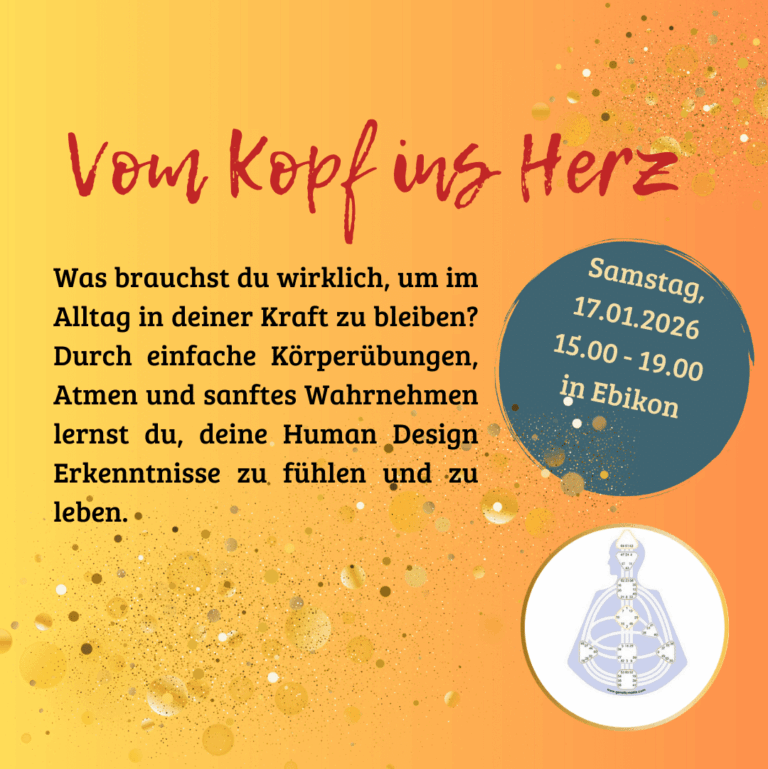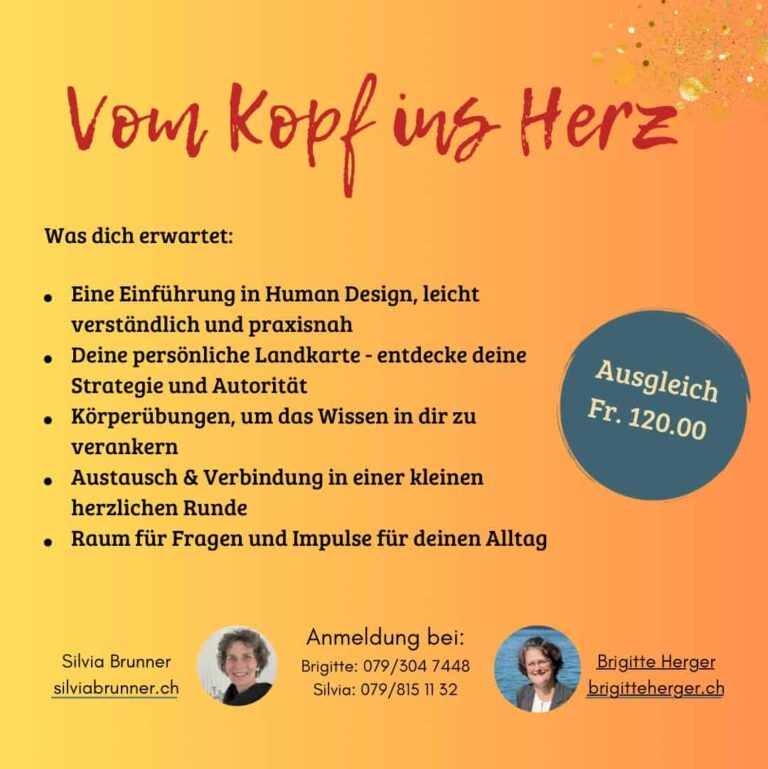 Silvia Brunner und ich haben uns über Human Design kennengelernt. Uns beiden ist es wichtig, ganzheitlich zu wachsen und dabei Menschen zu inspirieren, zu motivieren und persönlich zu begleiten. Durch Human Design wurde uns sehr schnell bewusst, welche Stärken jeder mitbringt. Dieses Bewusstsein und die Bereitschaft, sich selbst und dem andern Raum zu geben, macht unsere gemeinsame Reise so heilend, denn das fühlt sich frei, lebendig und bereichernd an. In unseren Retreats “Vom Kopf ins Herz – ganz DU selbst sein” öffnen wir diesen Raum auch für dich und laden dich ein, für ein paar Stunden einzutauchen, um mehr und mehr ganz DU selbst zu sein!